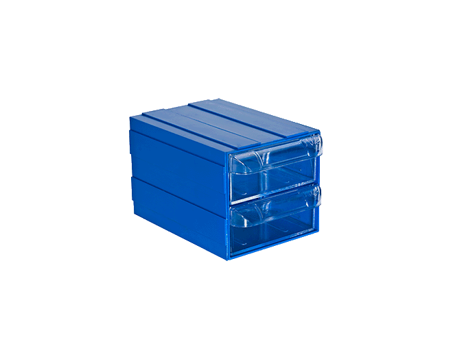 Plastik 2 şeffaf çekmeceli kutu Dış ölçüleri: 85 x 120 x 80 mmDışı mavi, çekmecesi şeffaf plastiktir.Kızakları sayesinden alt alta veya yan yana takılarak kombinasyon oluşturulabilir.Plastik Çekmeceli kutular depolama ve stok kontrolünü kolaylaştırmanın yanı sıra montaj sürelerini de kısaltmaktadır.. Sağlamlık ve direnç sayesinde ihtiyaca uygun tüm sektörlerde kullanılmaktadırlar.Elektrik & ElektronikOtomotiv ve Yan SanayiiSağlık, İlaç ve KozmetikMakine SanayiiHırdavat ve NalburiyeParkende SektörüHavacılık Sektörü 102-D Plastik Çekmeceli Kutu102-D plastik çekmeceli kutu, küçük parçaların düzenli depolanması için tasarlanmış modüler plastik çekmeceli kutu modelidir. 102 serisinin geliştirilmiş varyantı olarak daha farklı kullanım ihtiyaçlarına çözüm sunar.Şeffaf çekmecesi sayesinde içindeki ürünler kolayca görülebilir.