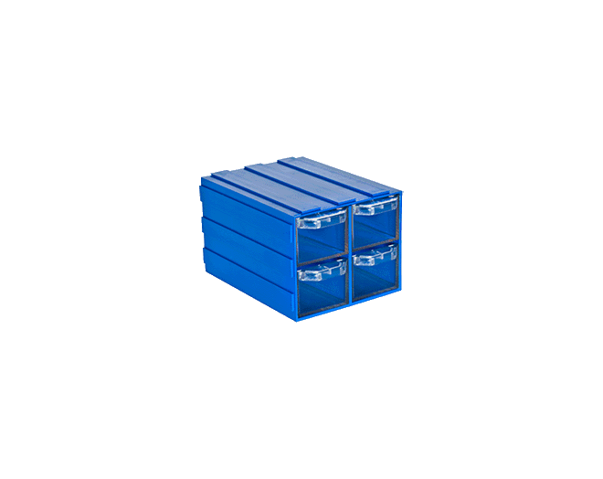 Plastik şeffaf 4 çekmeceli kutu Dış ölçüleri: 103 x 134 x 83 mmDışı mavi, çekmecesi şeffaf plastiktir.Kızakları sayesinden alt alta veya yan yana takılarak kombinasyon oluşturulabilir.141 ve 142 ile birbirine takılabilir.Plastik Çekmeceli kutular depolama ve stok kontrolünü kolaylaştırmanın yanı sıra montaj sürelerini de kısaltmaktadır.. Sağlamlık ve direnç sayesinde ihtiyaca uygun tüm sektörlerde kullanılmaktadırlar.Elektrik & ElektronikOtomotiv ve Yan SanayiiSağlık, İlaç ve KozmetikMakine SanayiiHırdavat ve NalburiyeParekende SektörüHavacılık SektörüKızakları sayesinden alt alta veya yan yana takılarak kombin oluşturulabilirler