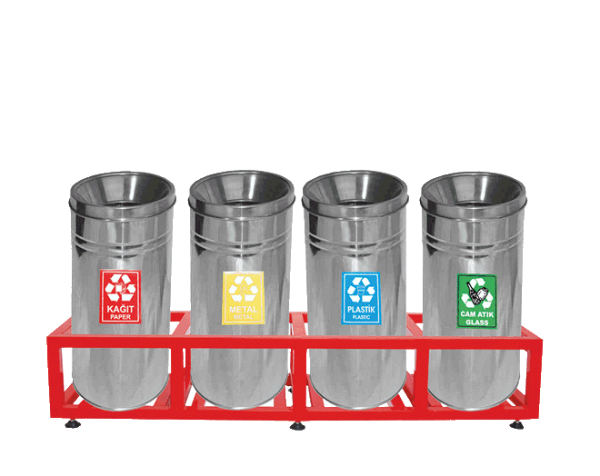 Paslanmaz 4 adet 27 litre bazalı atık kova setiÖlçüleri: 1150 x 300 x 650 mmCam atık, Plastik atık , Kağıt atık ve Metal atık stikerlidir ÇK-1812 4’lü Geri Dönüşüm ve Sıfır Atık KovasıÇK-1812 4’lü atık kovası, geri dönüşüm projeleri ve sıfır atık uygulamaları için tasarlanmış paslanmaz metal gövdeli profesyonel atık ayrıştırma setidir. Dört ayrı haznesi sayesinde atıkların düzenli ve hijyenik şekilde ayrıştırılmasını sağlar.Kurumsal alanlarda modern ve estetik çözümler sunar.