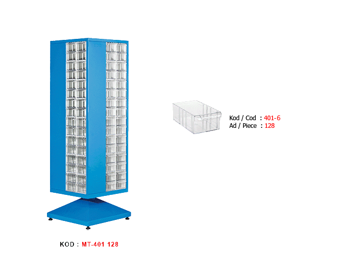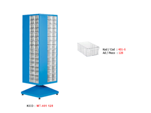 128 Plastik çekmeceli kutulu, dört yönlü dönen metal gövdeli dolapDış ölçüleri: 480 x 480 x 1540 mm401-6 çekmece 128 ad. mevcuttur.Ekseni etrafında dönerek yerden ve zamandan tasarruf sağlar.Standart : Metal kısımları Lacivert Ral 5002 elektrostatik boyalıdır.Opsiyonel: Farklı renklerde de özel olarak üretilebilir.