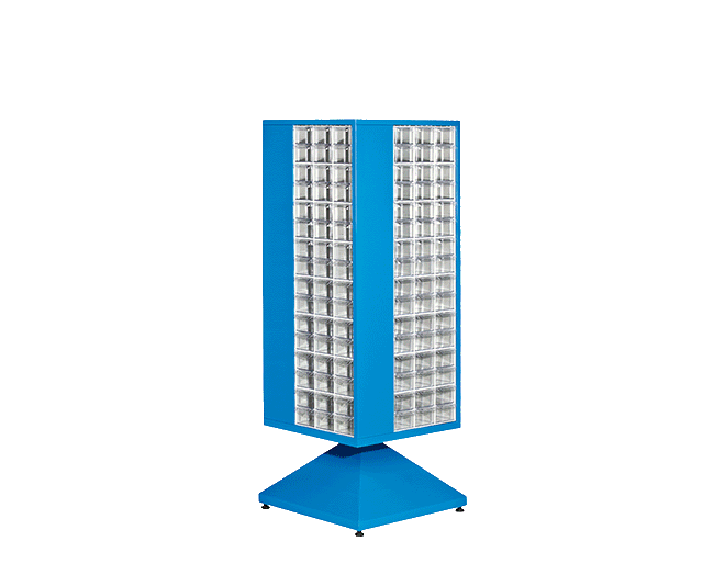 192 Plastik çekmeceli kutulu, dört yönlü dönen metal gövdeli dolapDış ölçüleri: 600 x 600 x 1660 mm401-6 çekmece 192 ad. mevcuttur.Ekseni etrafında dönerek yerden ve zamandan tasarruf sağlar.Standart : Metal kısımları Lacivert Ral 5002 elektrostatik boyalıdır.Opsiyonel: Farklı renklerde de özel olarak üretilebilir.