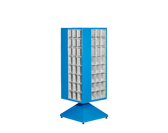 96 Plastik çekmeceli kutulu, dört yönlü dönen metal gövdeli dolapDış ölçüleri: 600 x 600 x 1660 mm401-3 çekmece 96 ad. mevcuttur.Ekseni etrafında dönerek yerden ve zamandan tasarruf sağlar.Standart : Metal kısımları Lacivert Ral 5002 elektrostatik boyalıdır.Opsiyonel: Farklı renklerde de özel olarak üretilebilir.
