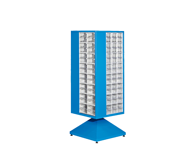 176 Plastik çekmeceli kutulu, dört yönlü dönen metal gövdeli dolapDış ölçüleri: 600 x 600 x 1660 mm401-9 72 ad. / 401-6 48 ad. / 401-3 24 ad. / 401-4 32 ad. çekmece mevcuttur.Ekseni etrafında dönerek yerden ve zamandan tasarruf sağlar.Standart : Metal kısımları Lacivert Ral 5002 elektrostatik boyalıdır.Opsiyonel: Farklı renklerde de özel olarak üretilebilir.
