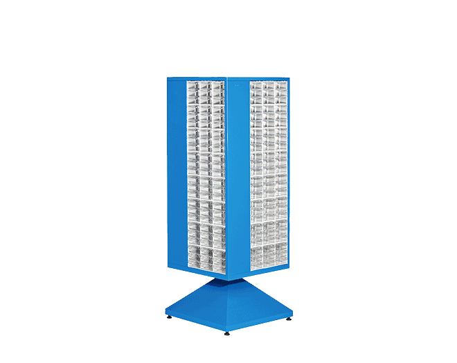 220 Plastik çekmeceli kutulu, dört yönlü dönen metal gövdeli dolapDış ölçüleri: 600 x 600 x 1900 mm401-9 90 ad. / 401-6 60 ad. / 401-3 30 ad. / 401-4 40 ad. çekmece mevcuttur.Ekseni etrafında dönerek yerden ve zamandan tasarruf sağlar.Standart : Metal kısımları Lacivert Ral 5002 elektrostatik boyalıdır.Opsiyonel: Farklı renklerde de özel olarak üretilebilir.