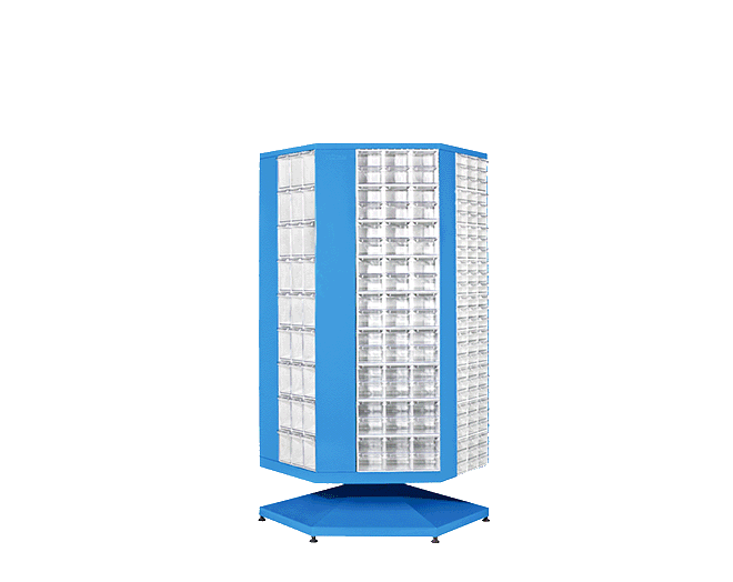 333 Plastik çekmeceli kutulu, altı yönlü dönen metal gövdeli dolapDış ölçüleri: 1050 x 1050 x 1760 mm401-3 27 / 401-4 36 ad. / 401-6 108 ad. / 401-9 162 ad. çekmece mevcuttur.Ekseni etrafında dönerek yerden ve zamandan tasarruf sağlar.Dönme çapı 110 cm’dir. 110 cm’den dar kapı ve yerlerden geçmez.Standart : Metal kısımları Lacivert Ral 5002 elektrostatik boyalıdır.Opsiyonel: Farklı renklerde de özel olarak üretilebilir.