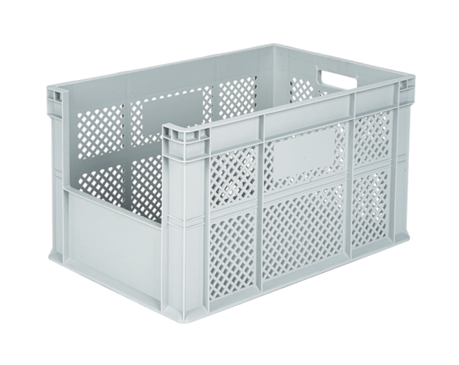 Plastik ön kısa kenarı yarım açık, yanları delikli ve altı kapalı kasa.Dış ebatları: 400x600x 340 mm, İç ebatlar:365 x 565 x324 mm
