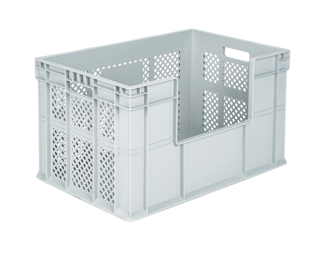Plastik uzun kenarı açık, yanları delikli ve altı kapalı kasa.Dış ebatları: 400x600x 340 mm, İç ebatlar:365 x 565 x324 mm
