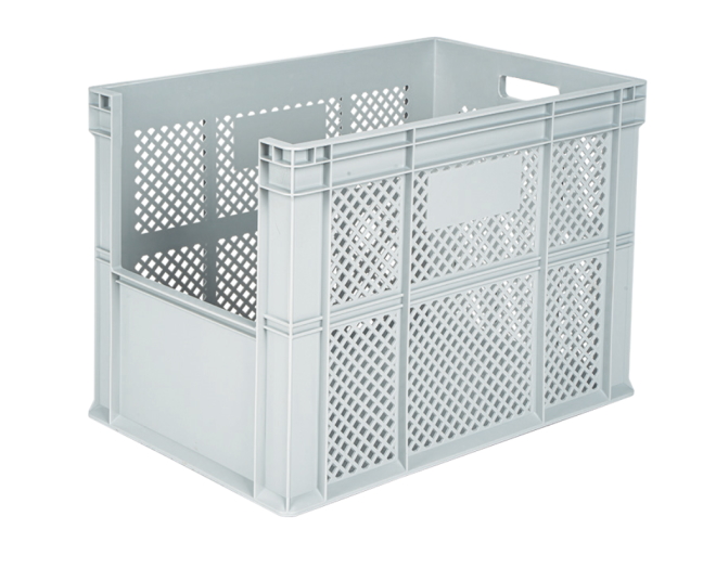 Plastik kısa kenarı yarım açık, yanları delikli ve altı kapalı kasaDış ebatları: 400x600x 425 mm, İç ebatlar:365 x 565 x 410 mm