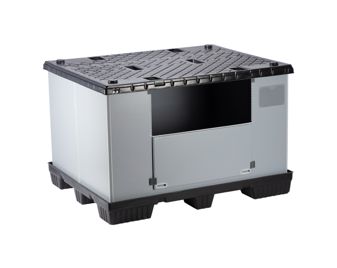 Ürün kutu yapısına uygun HDPE palet ve kapak ayrıca Trilamine PP kutudan oluşmaktadır.Ürün yüksek standartlarda koruma sağlarken aynı zamanda katlanabilir yapısı sayesinde az yer kaplar.Ürün yanında yer alan açılıp kapanabilen yan kapağı sayesinde ürün içinden malzemelerin alınmasını veya koyulmasını kolaylaştırır.Ürün