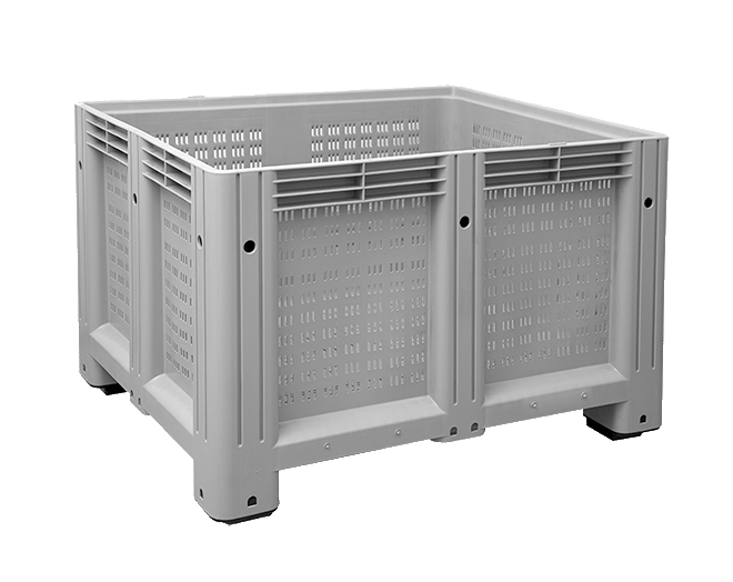Plastik altı ve yanları delikli, 4 ayaklı konteyner.