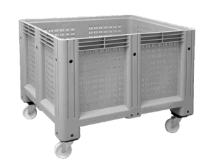 Plastik altı ve yanları delikli, tekerlekli konteyner.
