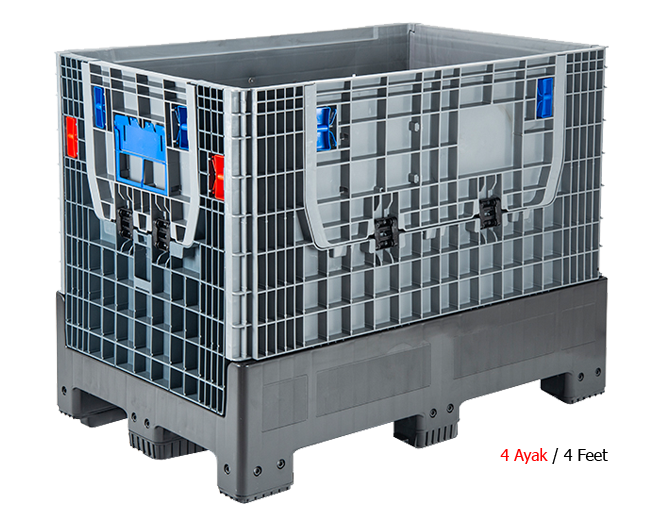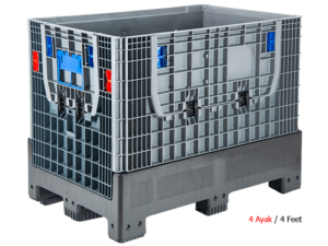 Plastik yanları ve altı kapalı katlanır konteyner 4 ayak ve 2 kızaklı modelleri mevcuttur.