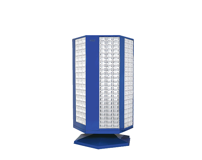 S-MT-SÜPER-2 387 Plastik çekmeceli kutulu, altı yönlü dönen metal gövdeli dolapDış ölçüleri: 950 x 950 x 1840 mmS-202 87 ad. / S-351 138 ad. / S-401-6 114 ad. / S-500-A 48 ad. çekmece mevcuttur.Ekseni etrafında dönerek yerden ve zamandan tasarruf sağlar.Dönme çapı 110 cm’dir. 110 cm’den dar kapı ve yerlerden geçmez.Standart : Metal kısımları Lacivert Ral 5002 elektrostatik boyalıdır.Opsiyonel: Farklı renklerde de özel olarak üretilebilir.
